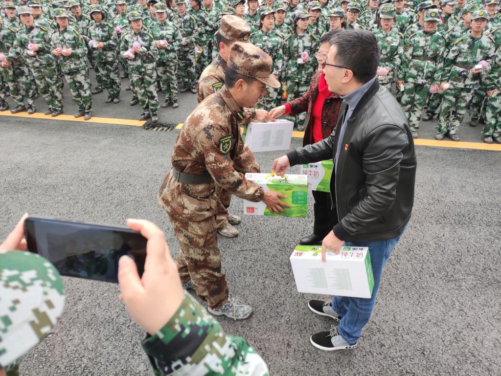 来到训练场,驻训老师学工办副主任崔宝玉与团部教师、教官热情迎接朱书记一行的到来。参训员工也集合列队,他们动作规范整齐,身姿挺拔。朱书记向同学们问好,代表公司表达了关心,赞扬了同学们的军训成果。并提出三点要求:一、坚持训练,学习国防知识,懂得自己肩负的责任;二、养成特别能吃苦精神、战斗精神、奉献精神;三、将军训养成的良好习惯带到未来的学习工作中。随后她代表公司向同学们发放了牛奶、苹果等慰问物资,鼓励同学们再接再厉,圆满完成军训任务。在同学们的陪同下,朱书记一行人参观了宿舍,检查内务成果。潘维副书记询问到作息时间是否习惯,军训感受如何。同学们表示很锻炼人,而且一定会坚持下去的。