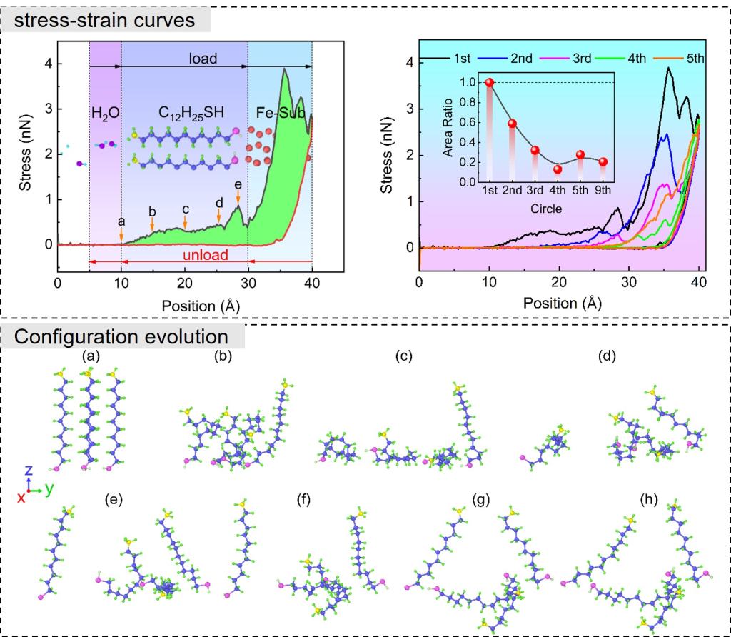 此项研究聚焦油气管道腐蚀防护中的实际问题,针对缓蚀剂膜在颗粒磨蚀下防护效能衰减的行业痛点,以十二烷-1-硫醇自组装膜为模型,采用分子动力学模拟方法,从原子尺度系统研究了缓蚀剂膜的动态损伤行为与自修复机制。研究明确了膜损伤的核心诱因、自修复的实现路径,以及永久缺陷引发局部腐蚀的作用过程,为耐冲蚀腐蚀缓蚀剂的研发提供了理论参考。
