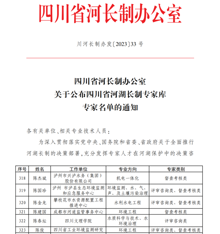 作为专家库成员陈春坛老师将发挥专业所长,积极响应习近平总书记发出的建设“造福人民的幸福河”伟大号召,全面落实习近平总书记来川视察重要知识精神,深入贯彻落实生态文明思想,为全省建设造福人民的幸福河湖贡献太阳成集团tyc234cc力量。